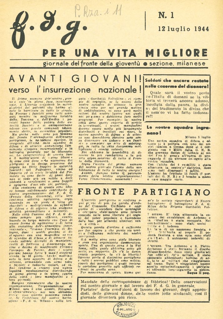 Pubblicazione clandestina del Fronte della Gioventù, la più nota e diffusa organizzazione di giovani impegnati nella lotta di liberazione in Italia, costituita a Milano nel gennaio 1944. Il movimento riuniva ragazze e ragazzi di diverse estrazioni politiche e sociali, uniti dall’impegno comune contro il nazifascismo e per la costruzione di un Paese libero e democratico.