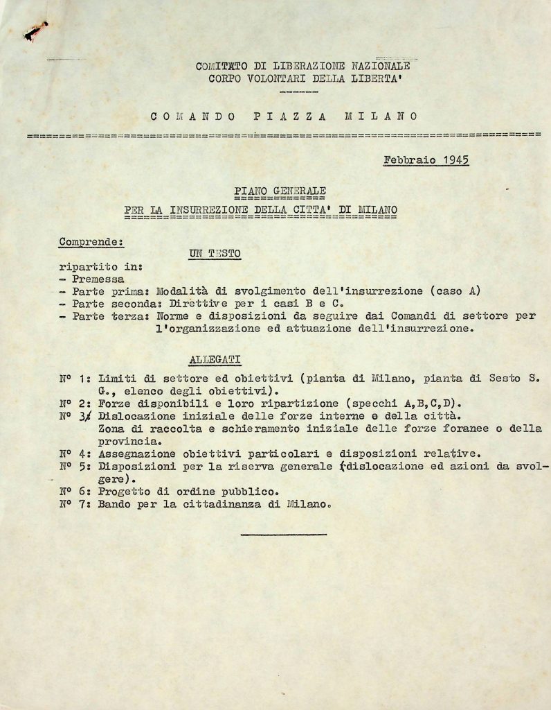Quarantanove pagine dattiloscritte, ordinate, senza correzioni: così si presenta il “Piano generale per la insurrezione della città di Milano”, datato febbraio 1945 e compilato a cura del Comando piazza di Milano, composto dal Comitato di liberazione nazionale e dal Corpo volontari della libertà. Due mesi prima del 25 aprile nulla è lasciato al caso: uomini, armi, mezzi, luoghi da occupare, sabotaggi, posti di blocco, ruolo delle forze dell’ordine e gestione dei prigionieri. Ma anche un invito esplicito a non affrettare i tempi, ad attendere il momento propizio perché l’insurrezione non può fallire. Quale futuro attende chi si batteva per la liberazione dal nazifascismo?