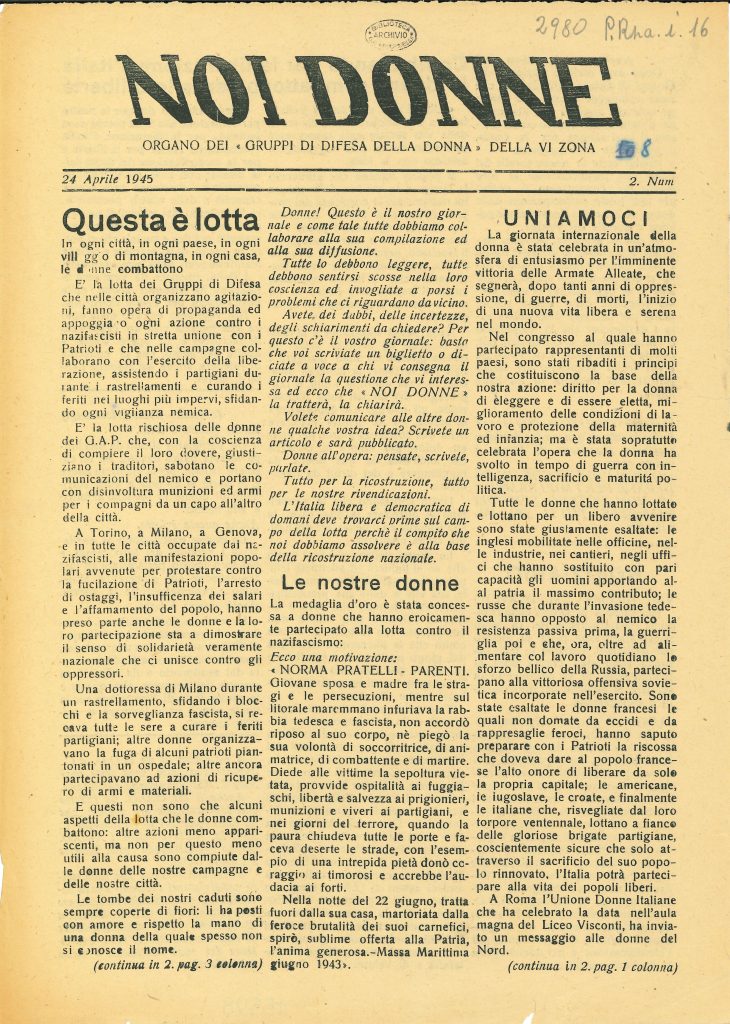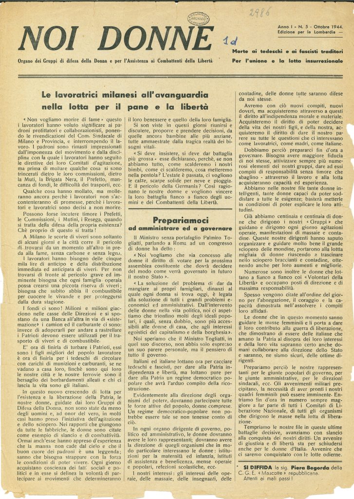«Noi Donne», edizione per la Lombardia a. 1, n. 5, ottobre 1944. Giornale clandestino organo