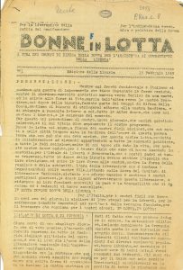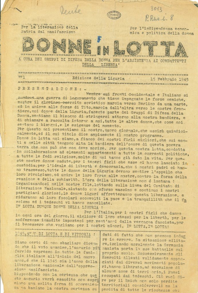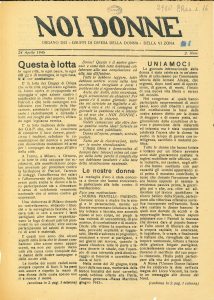 Primo numero dell’edizione ligure del giornale clandestino «Donne in lotta» a cura dei Gruppi di difesa della donna e per l’assistenza ai combattenti della libertà.